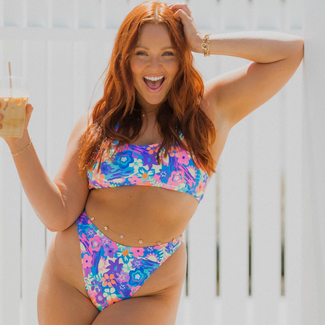 In these photos Madi has matched the Rainbow Jungle Crop Tie Back Bikini Top in size medium with the Rainbow Jungle Full Coverage Bikini Bottoms. Brooke has matched the Rainbow Jungle Crop Tie Back Bikini Top size extra large with the Rainbow Jungle High Leg Vintage Bikini Bottoms. This matching style and some of our ‘Perfectly Paired With’ suggestions are featured below!