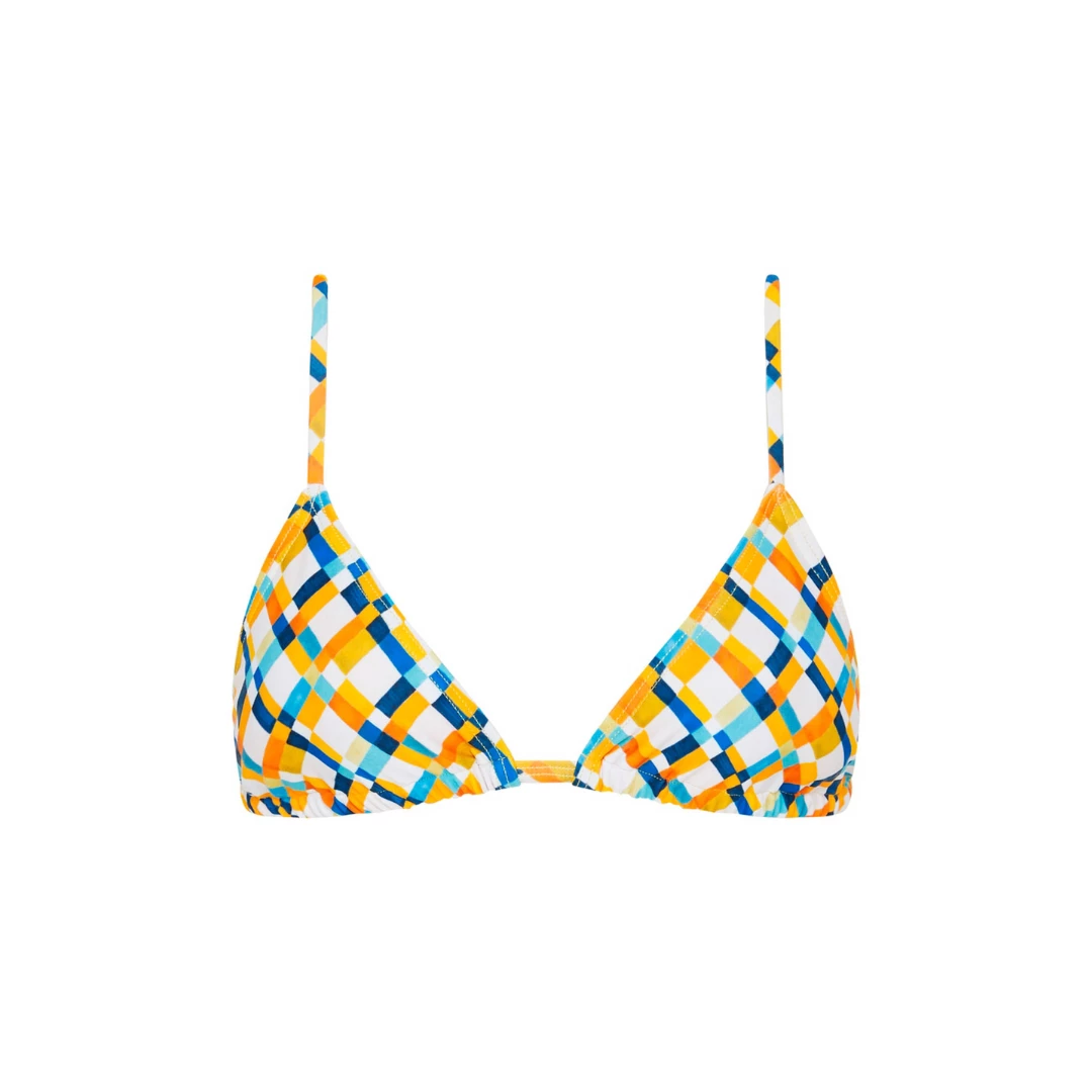 Classic, clean, and cool.. Every hour is happy hour in this alluring multi-coloured lattice geo print bikini! Hues of summer blues sprinkled with hints of tangerine, grab your icy drink and pack the sunscreen!