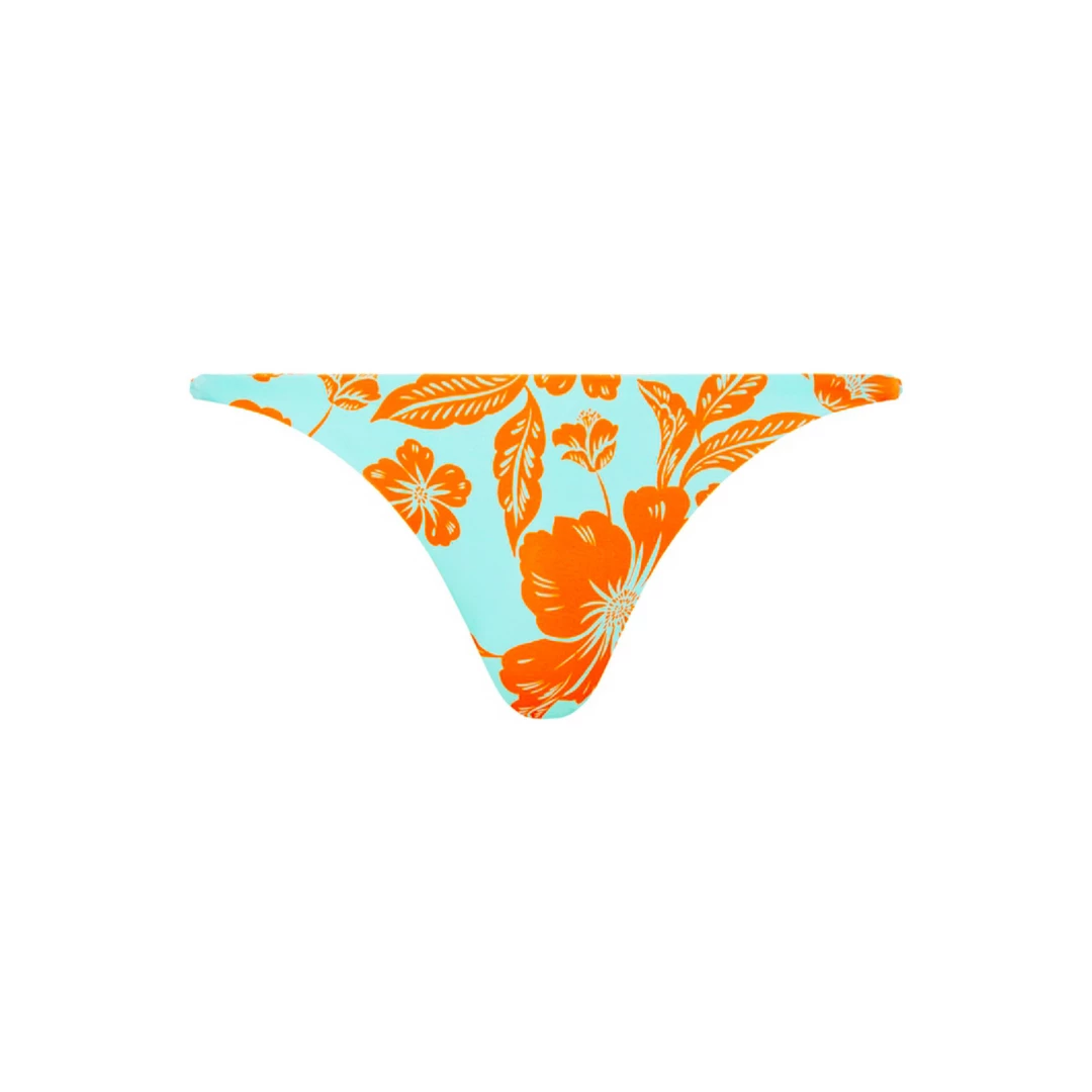 Oh. Hot. Dam. Is the only way to describe this magical bikini. With a bright, baby blue base + exotic tangerine hibiscuses; walking through Malibu never looked so good.