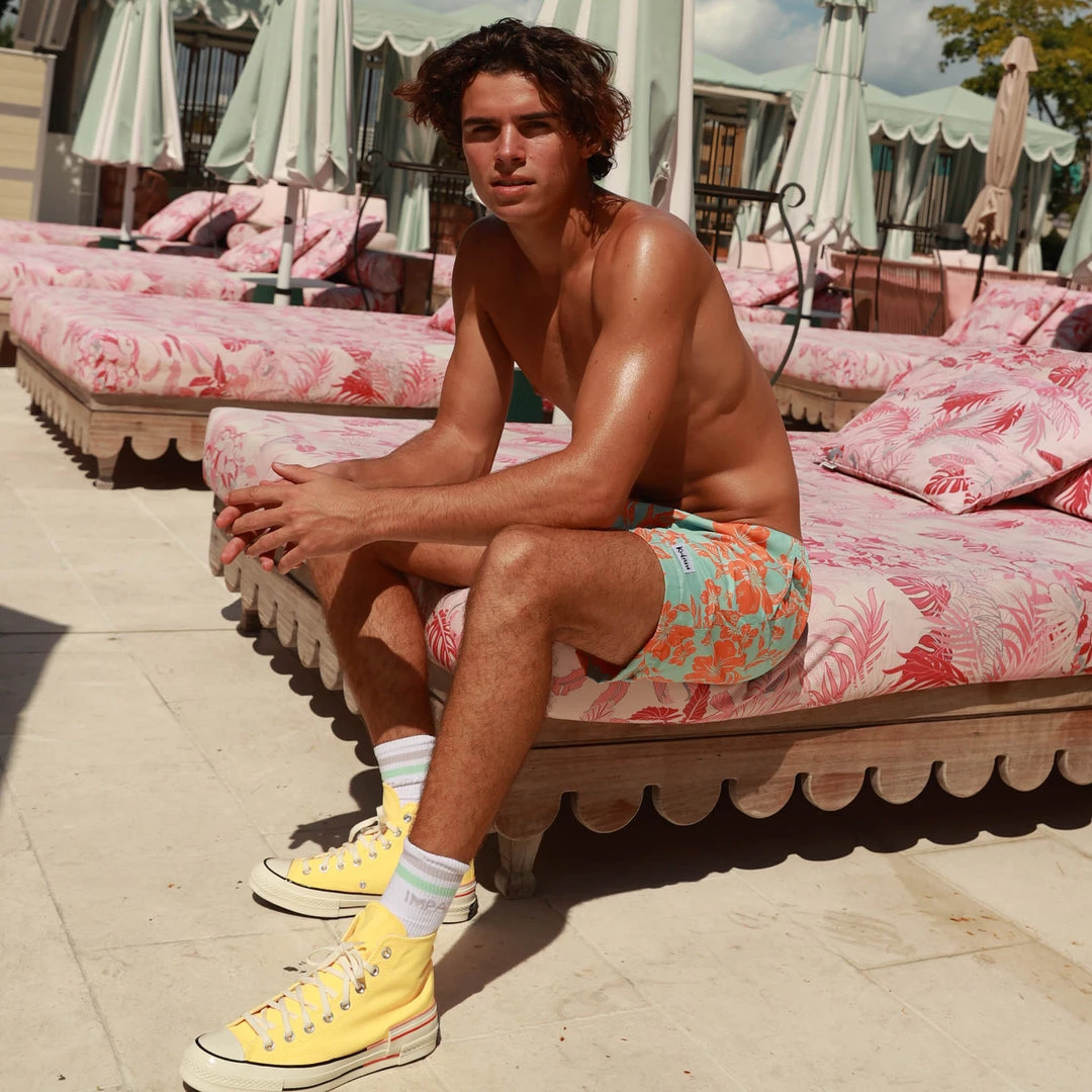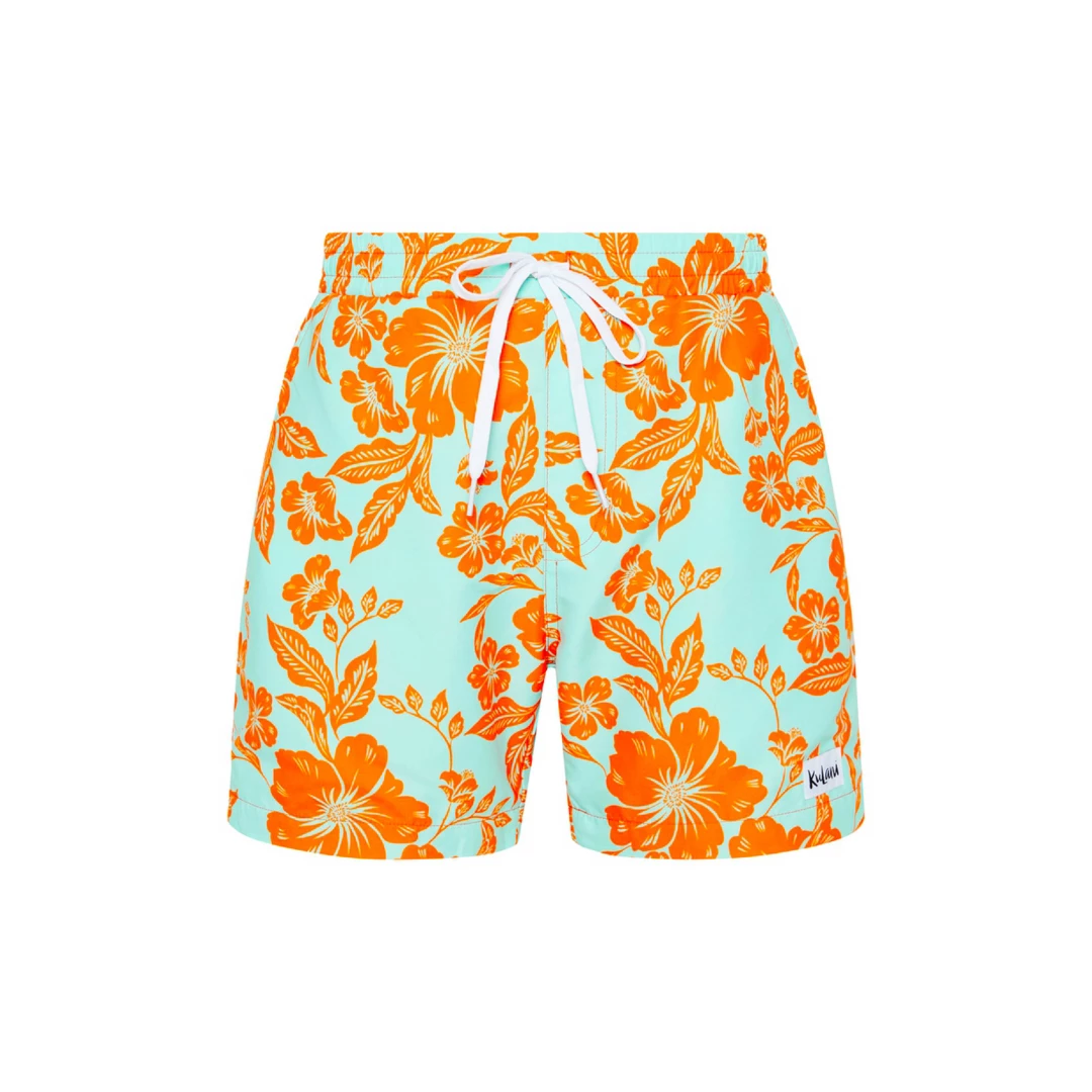 With a bright, baby blue base and exotic tangerine hibiscuses; walking through Malibu never looked so good. Dive into Kulani Kinis newest addition.. Men’s Board Shorts!! Perfect for beach days, barbecues, and summer living!Â