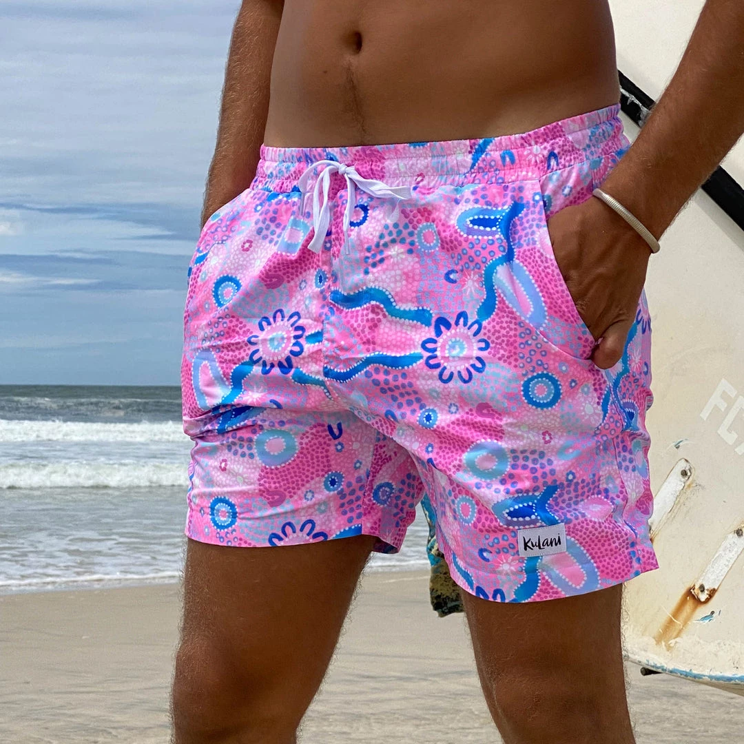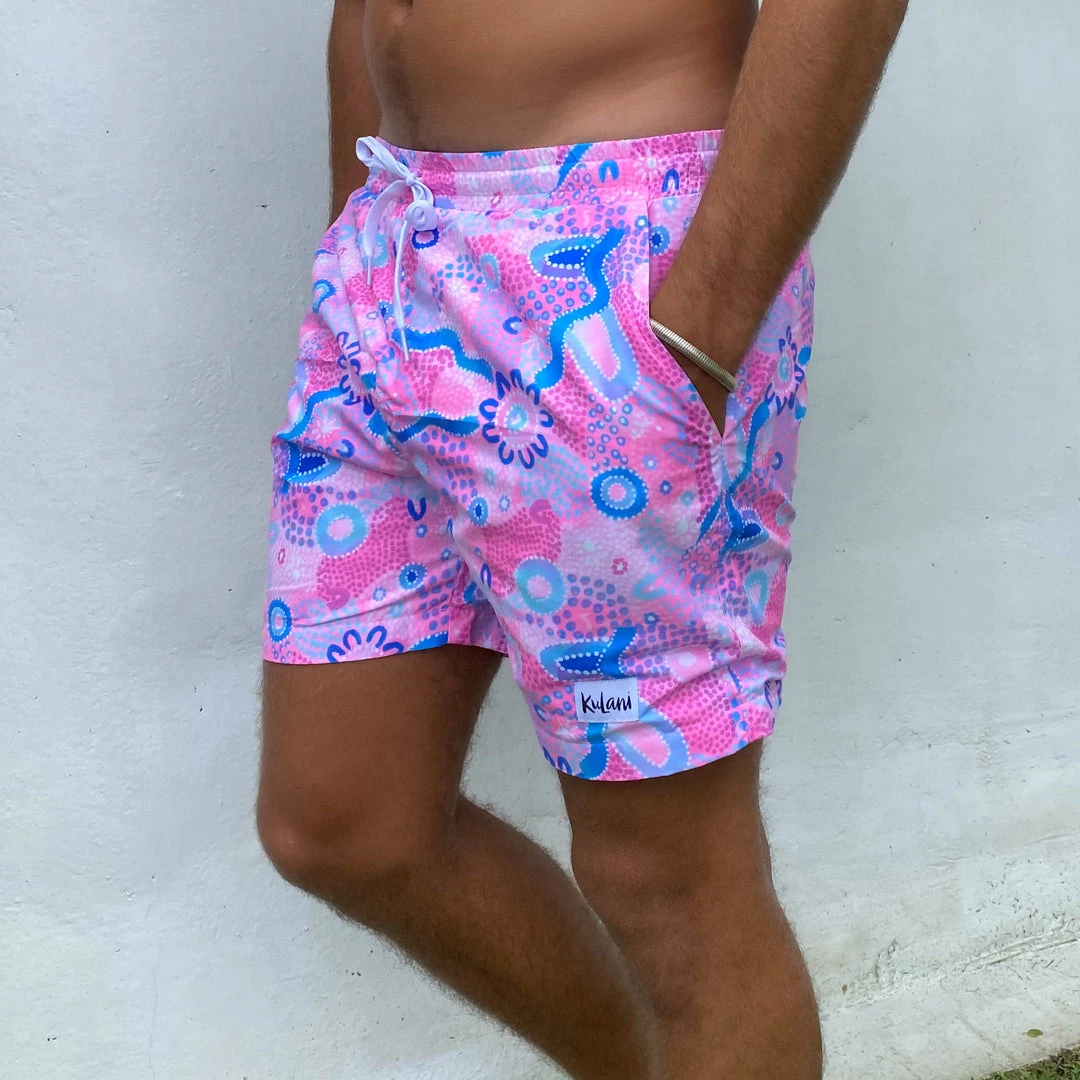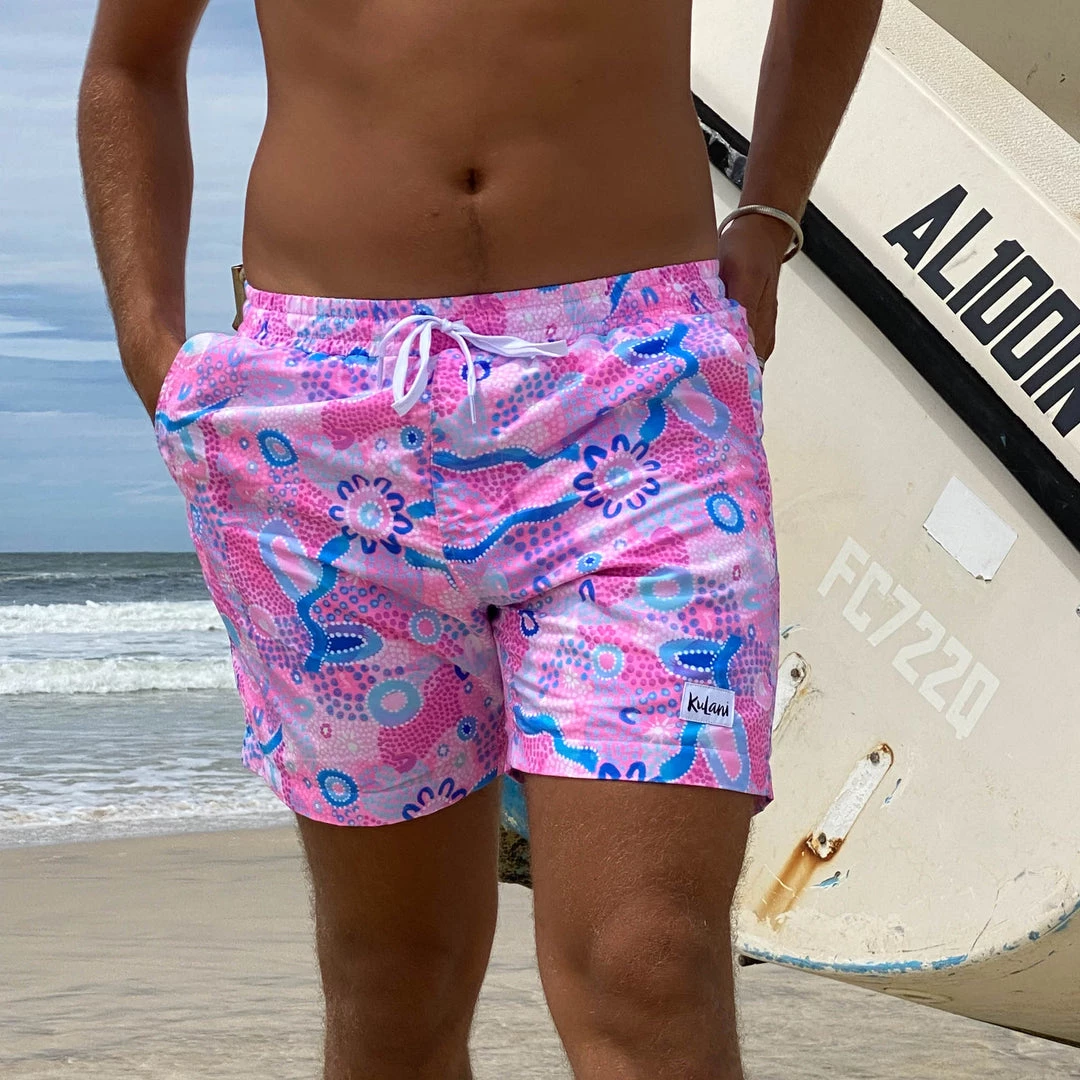 Hues of pink and blue that serve peace and gratitude. Dive into Kulani Kini’s newest addition.. Men’s Swim Trunks!! Perfect for beach days, barbecues, and summer living!Â